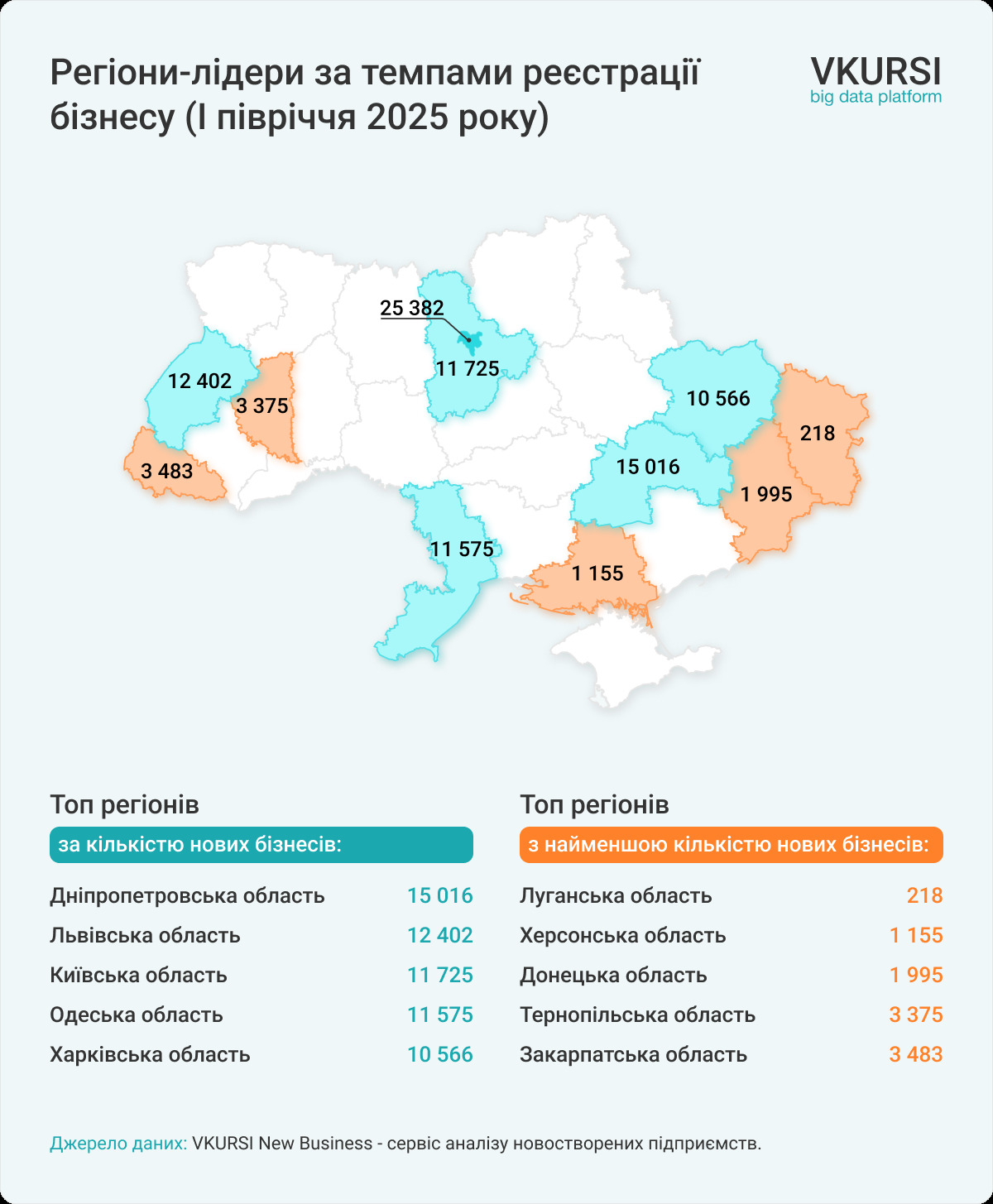 Регіонами-лідерами за діловою активністю стали: Дніпропетровська область, де зареєстровано 15,02 тис. нових юридичних і фізичних осіб-підприємців, Львівська – 12,4 тис., Київська – 11,73 тис., Одеська область – 11,58 тис. та Харківська – 10,57 тис.