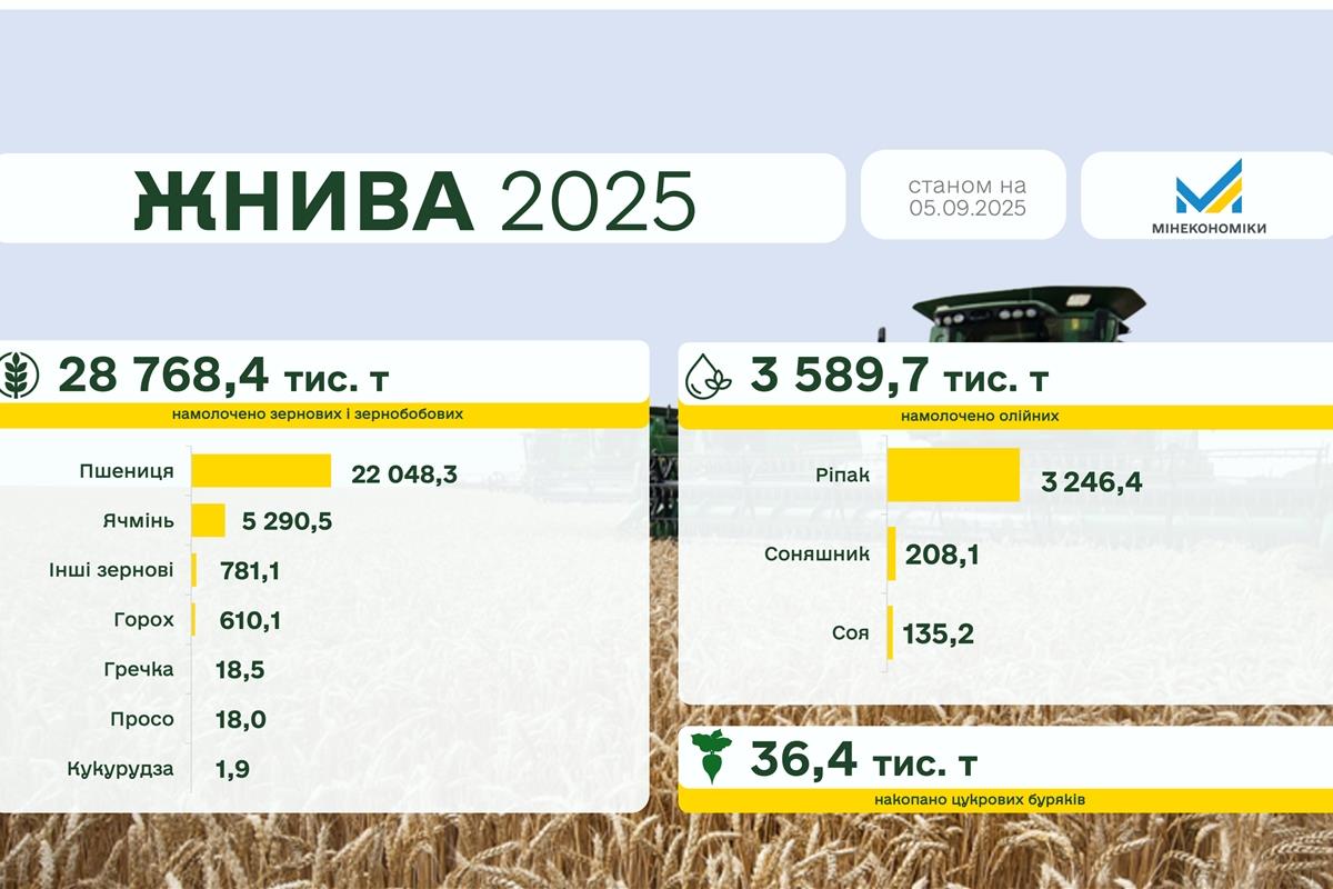 Окрім того, станом на 5 вересня 2025 року вже зібрано 28,77 млн тонн зернових культур на площі 6,93 млн га. Обмолочено 62% площ, засіяних цими культурами, зокрема: