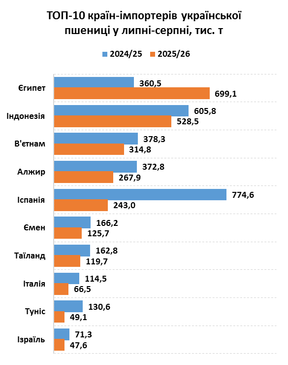 Зазначається, що тільки Єгипет залишився серед найбільших покупців та навіть подвоїв обсяги імпорту до 699 тис. тонн, очоливши рейтинг покупців на початку сезону.
