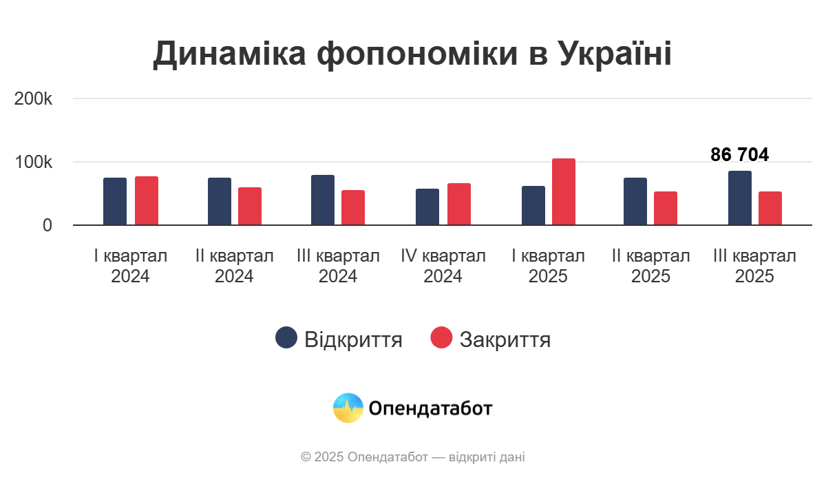 Водночас понад 213 тисяч підприємців вирішили завершити свою діяльність цьогоріч, це на 11% більше, ніж за той самий період 2024 року, повідомляє платформа для роботи з відкритими даними "Опендатабот" із посиланням на дані Єдиного державного реєстру.