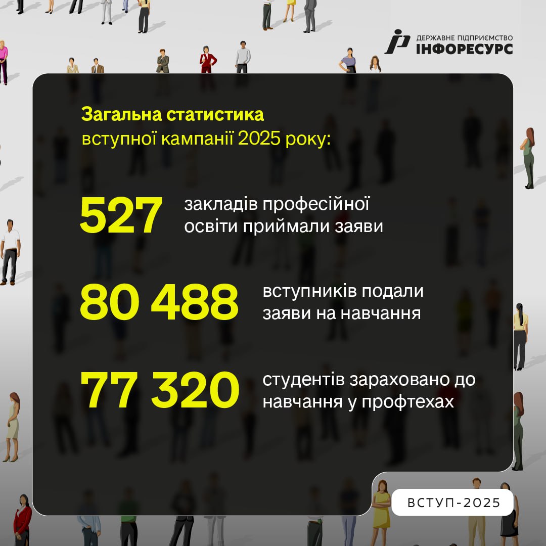 У МОН повідомили, що загалом 527 закладів професійної освіти приймали заяви від студентів. Було подано 80 488 заяв,і зараховано до навчання у профтехах 77 320 студентів.