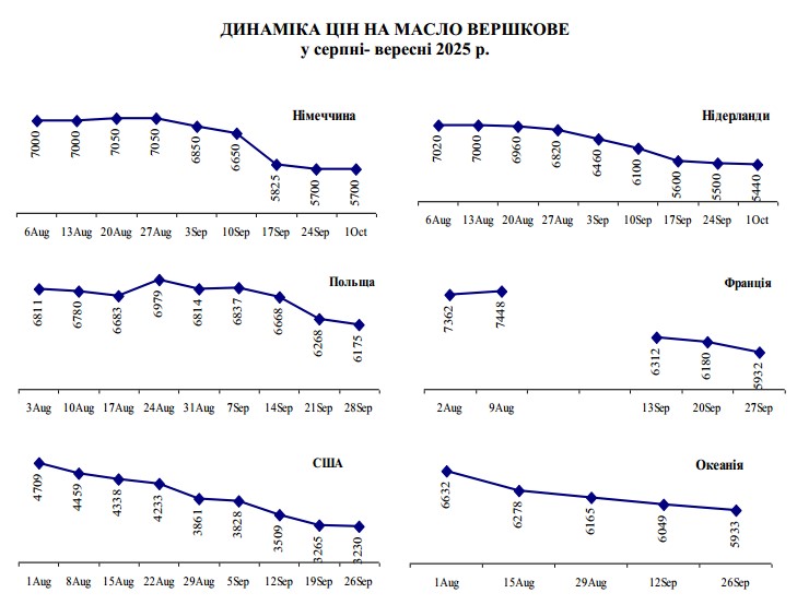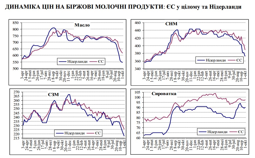Як наслідок низьких цін на молоко-сировину, ціни на молокопродукти у США, Океанії та країнах Меркосур суттєво нижчі за їх рівень у ЄС (навіть з урахуванням падіння у вересні) та Україні. Зокрема, поточна ціна масла в США складає нижче 3,3 тис. євро, що у 1,75 раза нижче європейського показника.