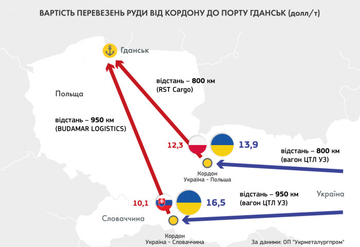 Згідно із цими даними, перевезення руди у вагоні ЦТЛ "Укрзалізниці" до кордону з Польщею коштує $13,9 за тонну. Для порівняння: транспортування цього самого обсягу вагонами RTS Cargo територією Польщі на аналогічну відстань близько 800 кілометрів до Гданська обійдеться у $12,3 за тонну.