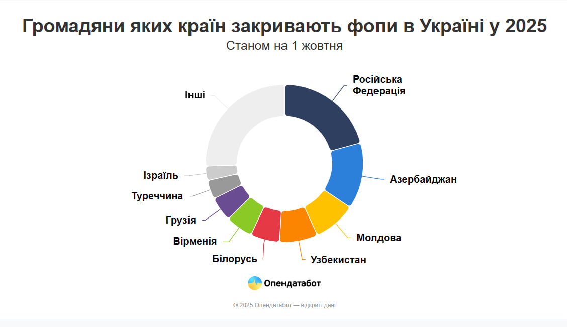 Найбільше серед нових підприємців походять з Азербайджану – 229 ФОПів (14%), наслідують громадяни РФ – 222 (14%), Узбекистану – 160 (10%), Молдови – 125 (8%) та Вірменії – 95 (6%).