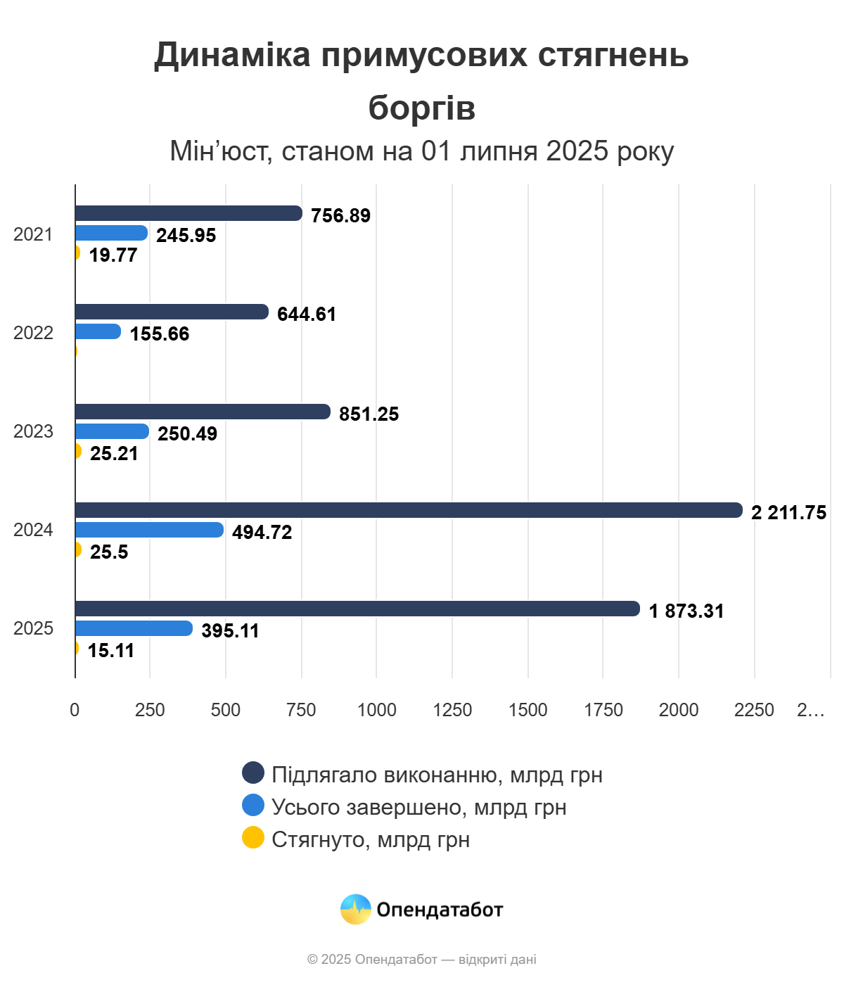 За шість місяців виконавцям передали 5 318 969 проваджень, з них 1,75 млн нових, а ще близько 3,7 млн мігрували з попередніх періодів. Водночас фактично борги стягнуто лише у 1,1 млн випадків на 15,11 млрд грн, тоді як завершено 1,5 млн проваджень на 395,11 млрд грн – отже виконано приблизно кожне п'яте.