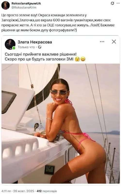 ГЕРОЇ ЕПОХИ ЗЕ Некрасова Злата Андріївна (нар. 10 жовтня 1991, Лабитнангі, РСФСР) - українська політична діячка, колишня заступниця голови Запорізької обласної державної адміністрації з 22 лютого 2021 по 19 травня 2023. Нагороджена Зеленським орденом княгині Ольги III ступеня.