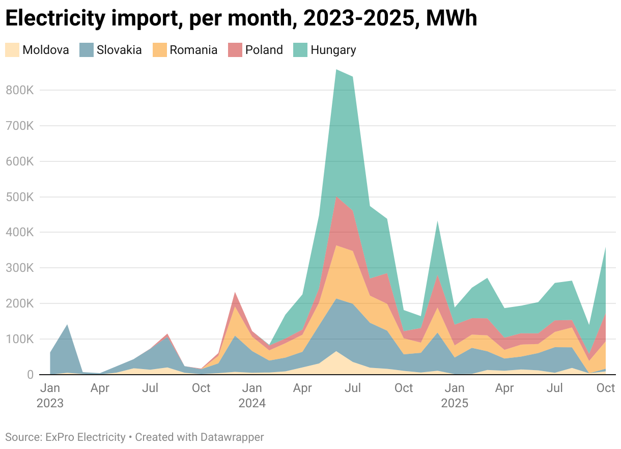 Водночас, експорт електроенергії у жовтні 2025 року впав на 85% через посилення обстрілів енергетичної інфраструктури. Загалом було експортовано 90,8 тис. МВт-год електроенергії до країн ЄС та Молдови.