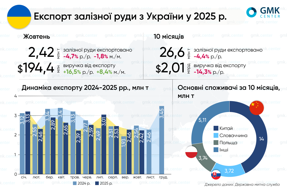 У жовтні Україна експортувала 2,42 млн т залізорудної сировини (ЗРС), що на 1,8% менше порівняно з попереднім місяцем, та на 4,7% до жовтня 2024-го. До Китаю спрямовано 1,14 млн т (-25,3% м./м.; -5,4% р./р.) сировини, Словаччини – 377,27 тис. т (+84,2% м./м.; +17,8% р./р.), Польщі – 398,49 тис. т (+48,4% м./м.; -3,3% р./р.).