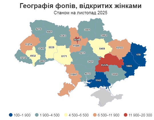 Найбільше нових жіночих бізнесів з’явилося у Києві – 20 286, далі йдуть Дніпропетровська область (15 129), Київська (11 846), Одеська (11 647) та Львівська (11 274). Водночас найвищу частку жінок серед нових підприємців мають Сумщина, Полтавщина та Одещина – по 63%. У жодному регіоні чоловіки не випередили жінок за кількістю створених ФОПів.