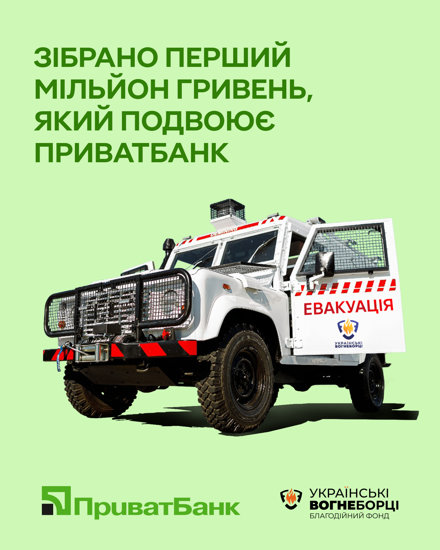 Державний "ПриватБанк" підтримав благодійну ініціативу, подвоївши перший мільйон гривень у рамках спільного збору коштів із "Благодійний фонд Українські Вогнеборці" на придбання броньованого евакуаційного автомобіля для потреб Державної служби з надзвичайних ситуацій (ДСНС).