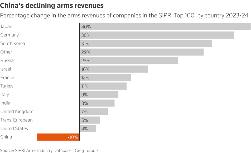 Спад доходів у Китаї контрастує з помітним зростанням прибутків великих постачальників озброєнь і військових послуг у світі, що зумовлено війнами в Україні та Газі, а також глобальною й регіональною напруженістю.