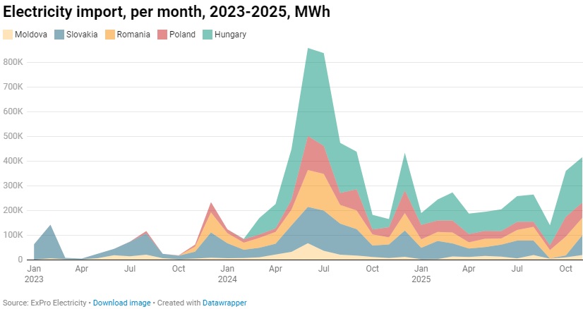 У листопаді 2025 року Україна збільшила імпорт електроенергії на 15% до 415 тис. МВт-год порівняно з жовтнем, коли також спостерігалося зростання імпорту.