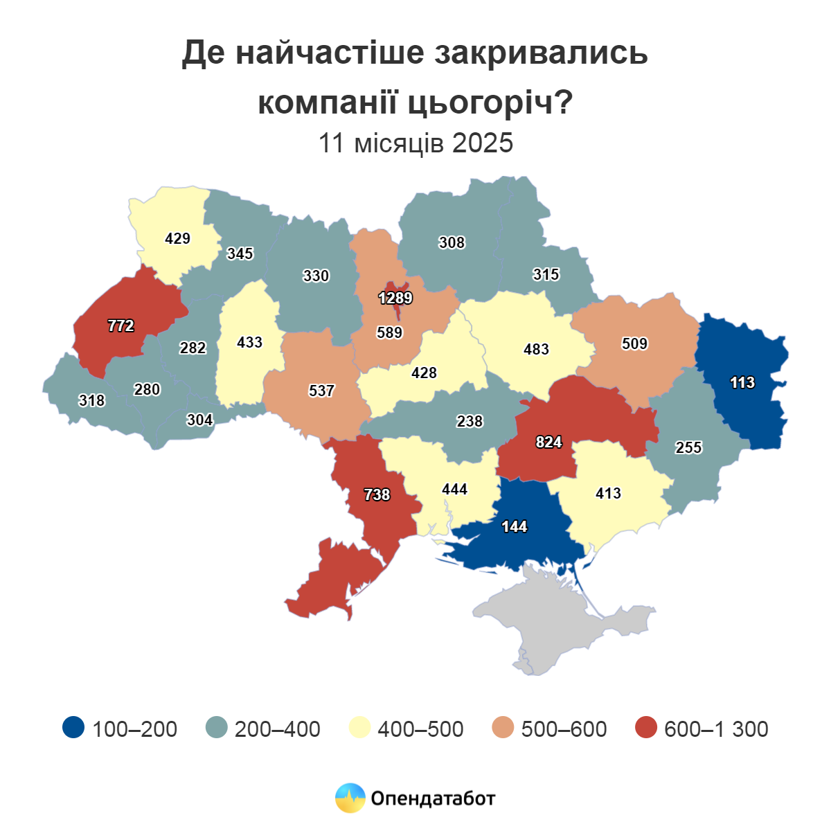 Понад 11 тисяч компаній припинили діяльність за 11 місяців 2025 року за даними Єдиного державного реєстру. Третина закриттів припала на Київ, Дніпропетровщину та Львівщину.