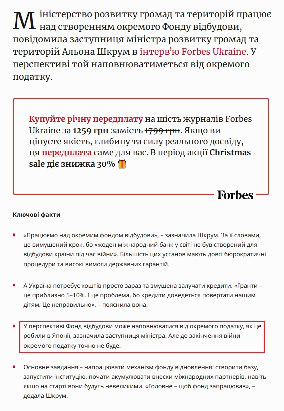 "В інтервʼю Forbes Ukraine я навела приклад, що окремі країни вводили для цього спеціальний податок. Після катаклізмів. Але так само й сказала, що це не наш варіант", – запевнила Шкрум.