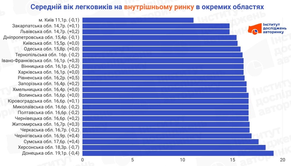 - Київ: із показником 11,1 року столиця зберігає значний відрив від решти країни. Київ – єдиний регіон, де середній вік не перевищує 12 років. Це пояснюється високою концентрацією нового та свіжопригнаного транспорту;