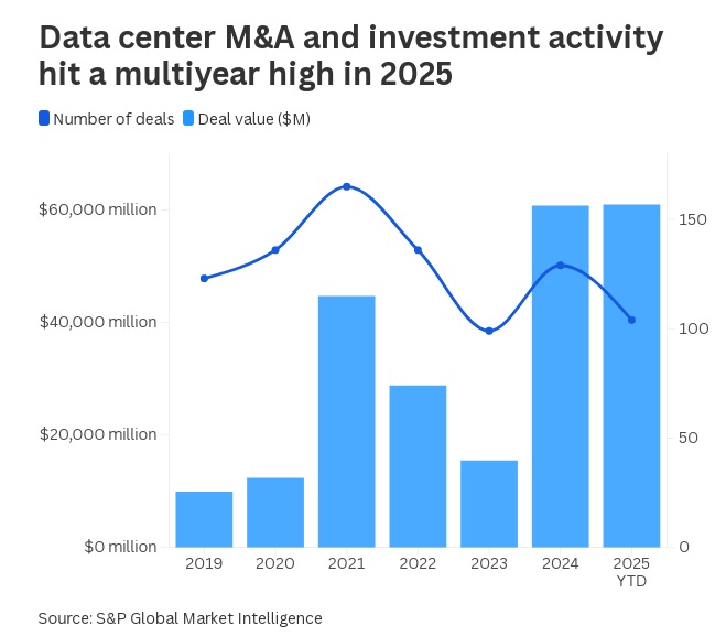 Обсяг глобальних інвестицій у дата-центри, включно з угодами злиття та поглинання (M&A), за 11 місяців 2025 року досяг рекордних $61 млрд, перевищивши показник за весь 2024 рік ($60,8 млрд).