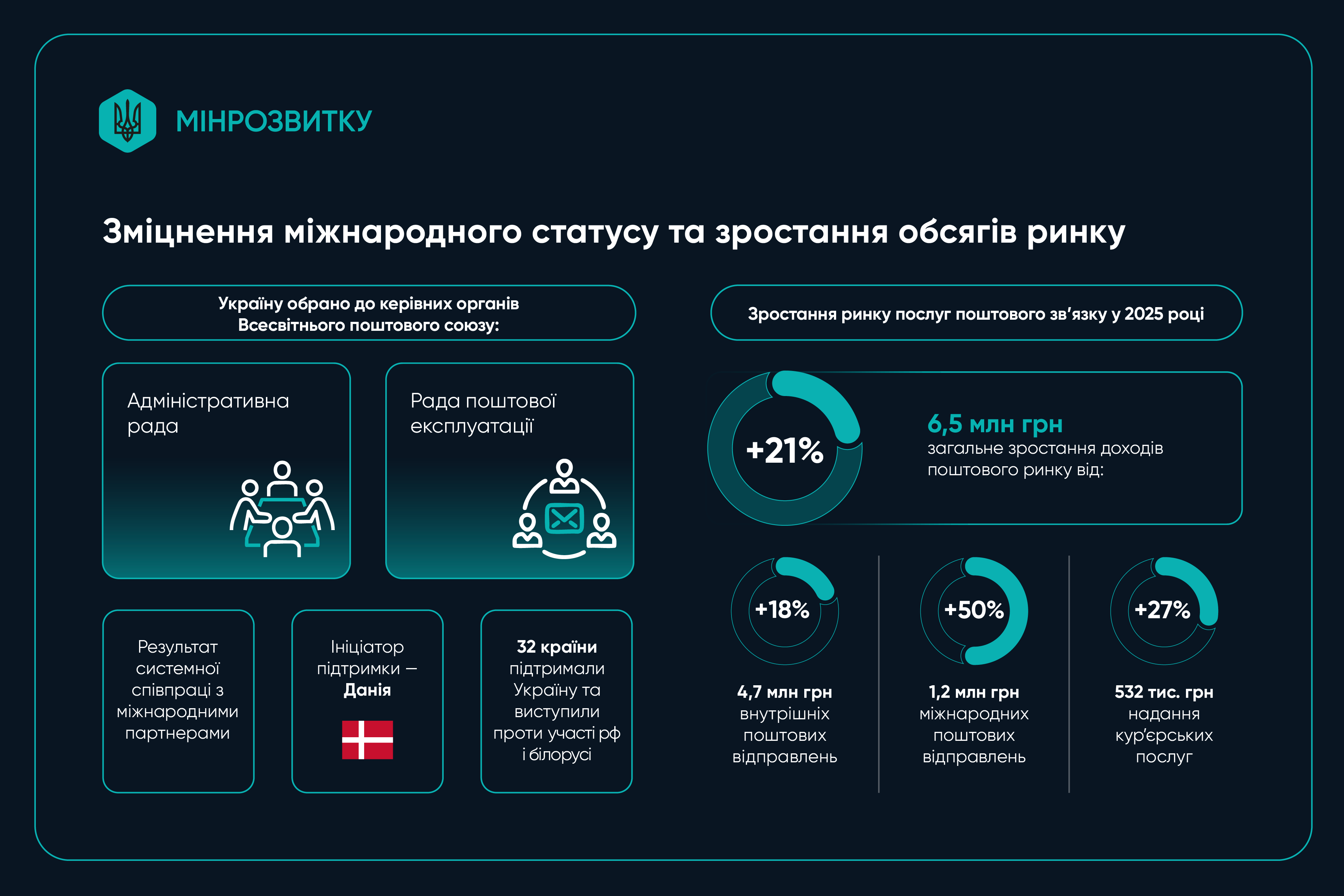 В Україні в 2025 році зросли доходи поштових операторів порівняно з минулим роком. Так, загальні доходи ринку надання послуг поштового зв'язку збільшились на 6,5 млн грн (на 21%).