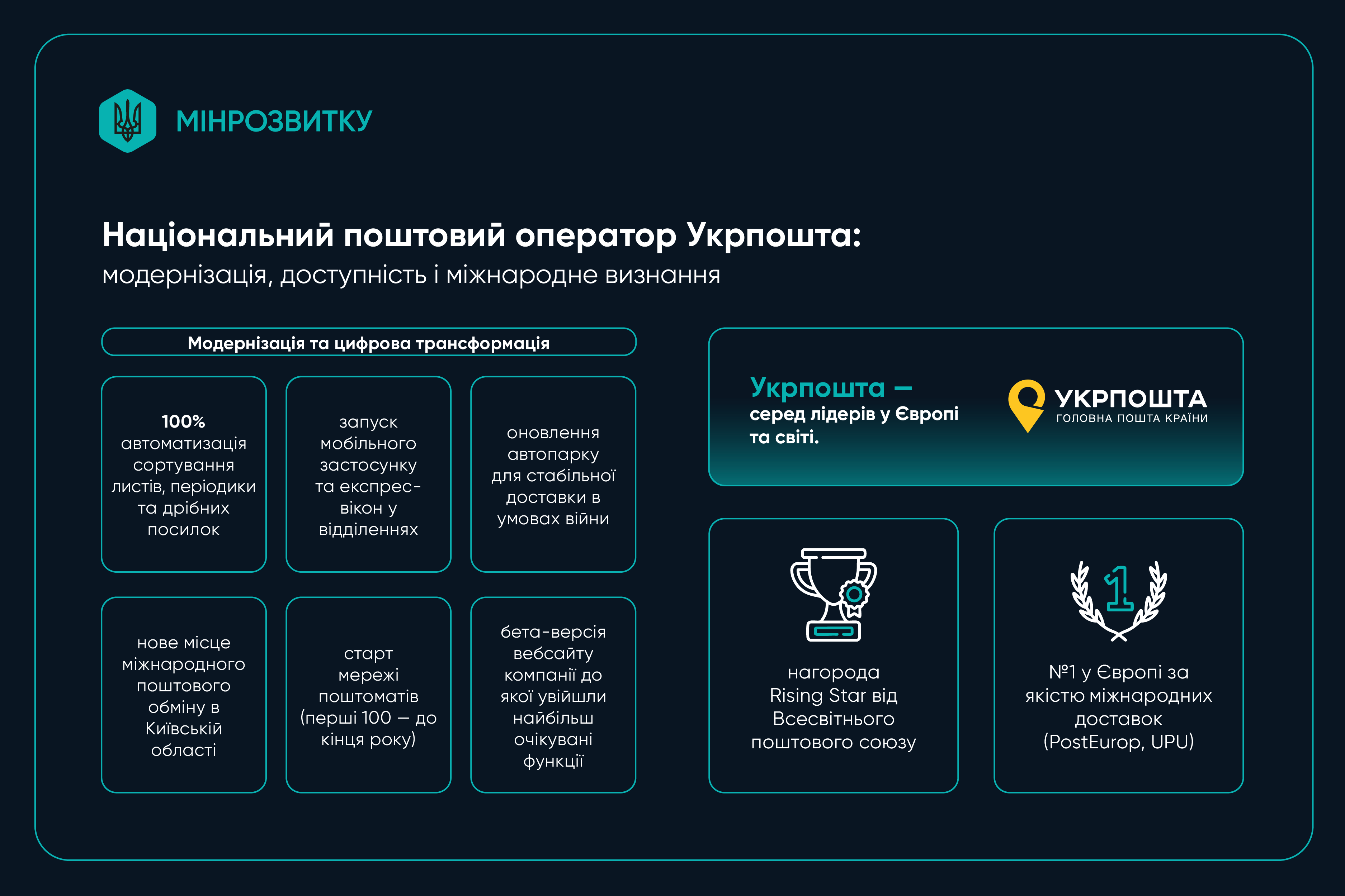 У Мінгромад повідомили, що цього року "Укрпошта" автоматизувала на 100% сортування листів, періодики та дрібних посилок, запустила мобільний застосунок і мережу експрес-вікон у відділеннях, що суттєво прискорило отримання відправлень.