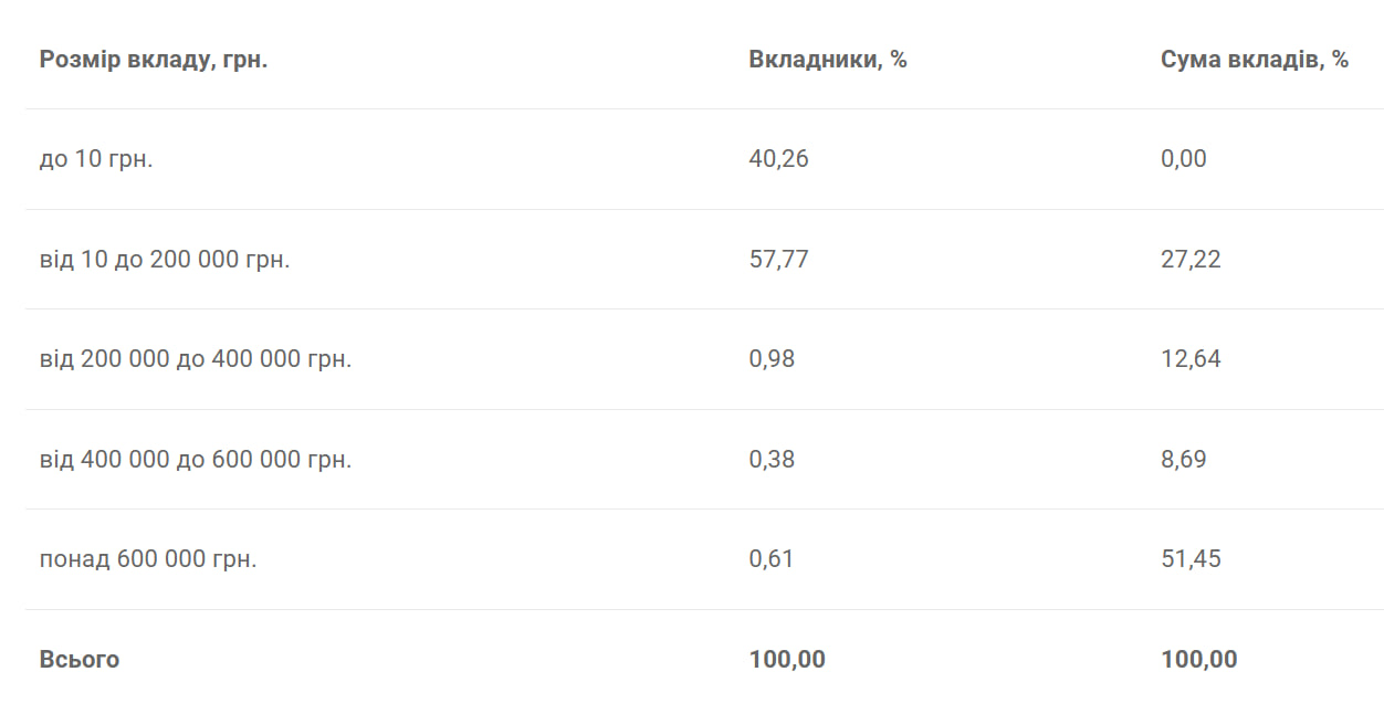 На 1 грудня 2025 року структура розподілу вкладів фізичних осіб у банківській системі за розмірами має наступний вигляд: