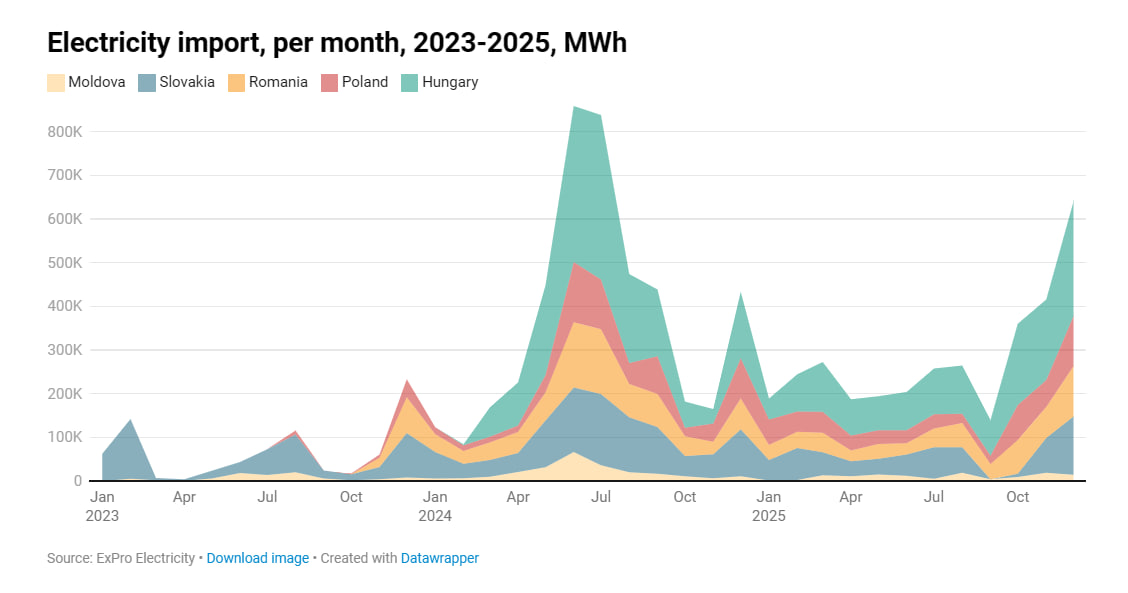 Україна в грудні 2025 року збільшила імпорт електроенергії на 53% порівняно з листопадом – до майже 640 тис. МВт-год.