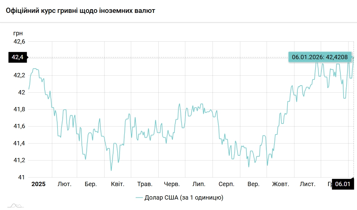 За підсумками торгів на міжбанку, Нацбанк встановив офіційний курс гривні до долара США на вівторок, 6 січня, на рівні 42,4208 грн/$, порівняно із 42,2942 грн/$ у понеділок. Це новий історичний мінімум. Попередній було зафіксовано 26 листопада на рівні 42,4015 грн/$.