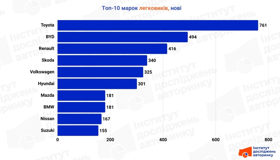 Toyota RAV4 (313 шт.) та Renault Duster (312 шт.) розійшлися лише в один автомобіль, демонструючи два полюси ринку: престижний кросовер проти практичного позашляховика. Toyota Land Cruiser Prado зайняла третю позицію, підтверджуючи популярність великих і надійних моделей.