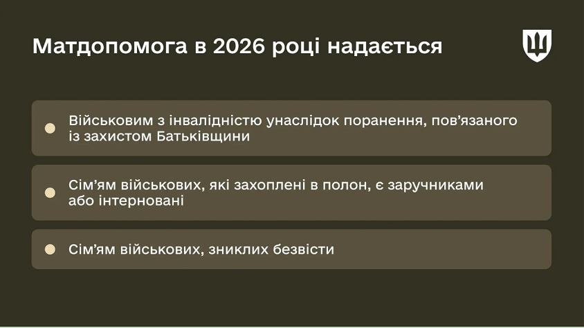 "У 2026 році вона виплачується у розмірі місячного грошового забезпечення військового. До нього входить посадовий оклад, оклад за військовим званням, надбавка за вислугу років та щомісячні додаткові види грошового забезпечення, крім винагород", ‒ зазначили у відомстві.