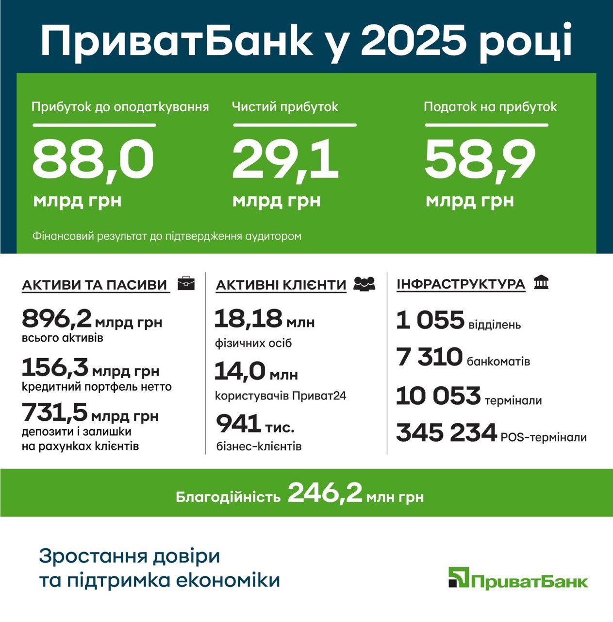 Таким чином, за результатами 2025 року до державного бюджету України буде перераховано близько 59 млрд грн податку на прибуток, що робить "ПриватБанк" найбільшим платником податків серед банків. Прибуток банку після вирахування податку на прибуток складе 29,1 млрд грн.