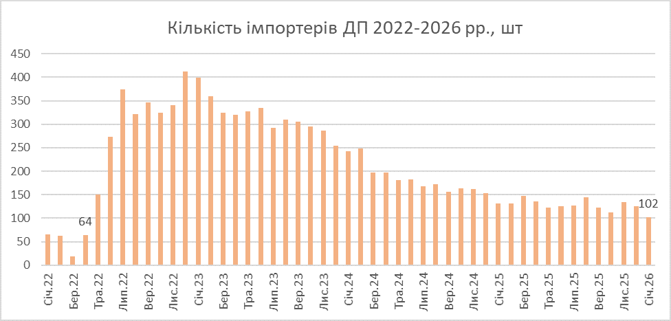 Кількість імпортерів у січні також стала найменшою з травня 2022 року, повідомляє галузеве видання enkorr із посиланням на дані Консалтингової групи "А-95".