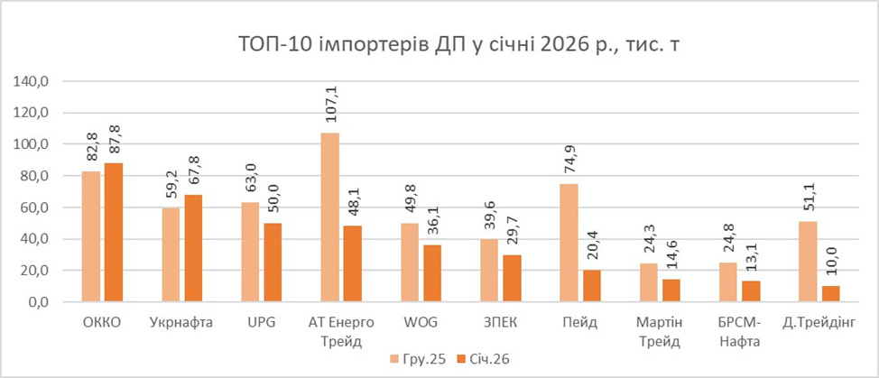 Зниження кількості трейдерів підсилило позиції десятки найбільших імпортерів, які завезли 83% усього обсягу дизелю (378 тис. тонн), порівняно із 74% у грудні.