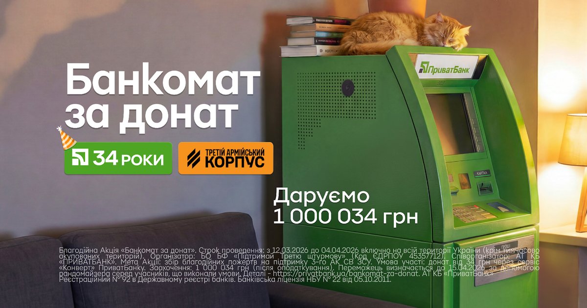 Він пояснив, що до 34-го дня свого народження "ПриватБанк" відкрив спеціальний Конверт для збору 34 мільйонів гривень на потреби Третього армійського корпусу. Кожен, хто перерахує від 34 гривень на цей Конверт, автоматично стане учасником розіграшу. Головний приз – справжній банкомат із сумою 1 000 034 гривні всередині.