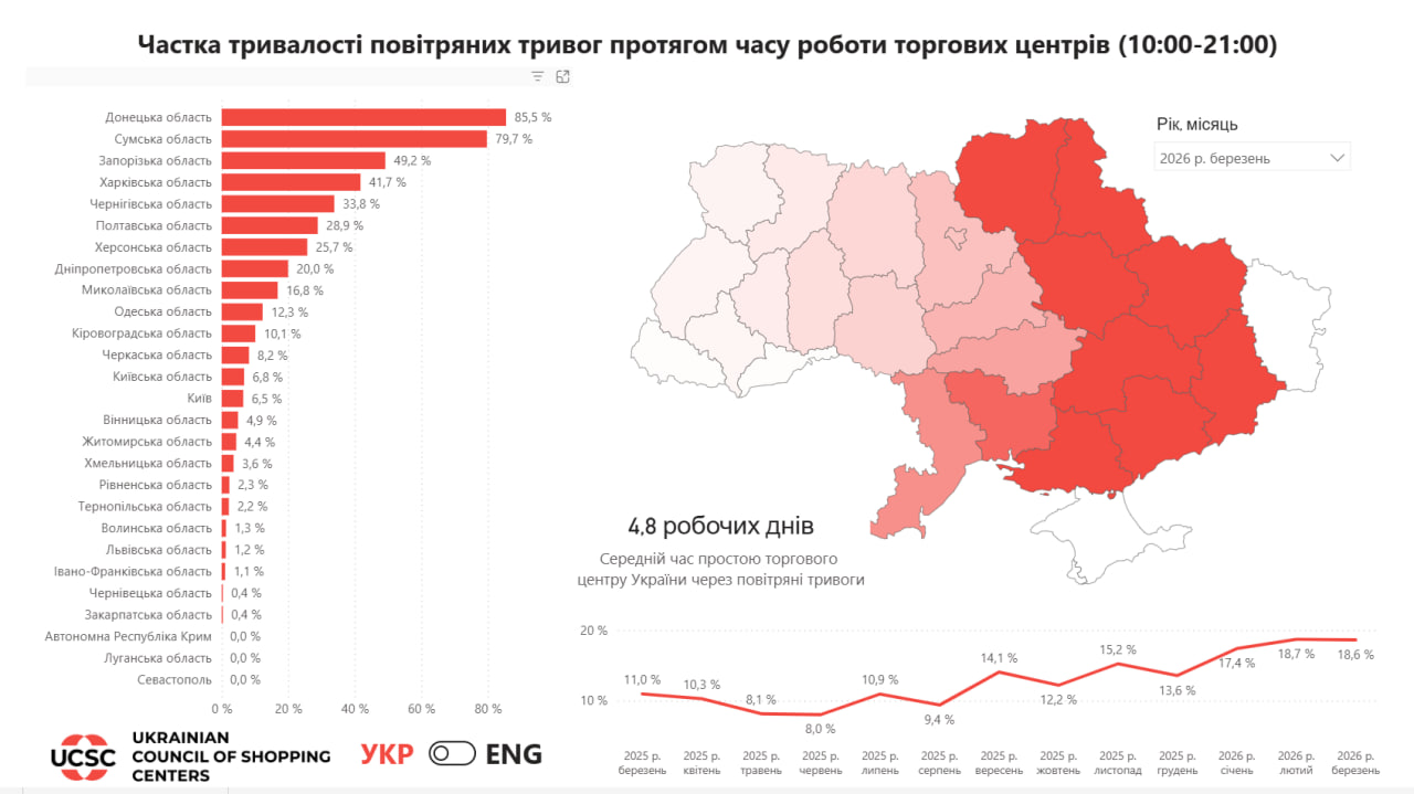 У середньому по Україні час вимушеного простою торгових центрів через повітряні тривоги сягнув 142,4 робочих днів із початку повномасштабного вторгнення, а в березні 2026 року – 4,8 робочих днів.