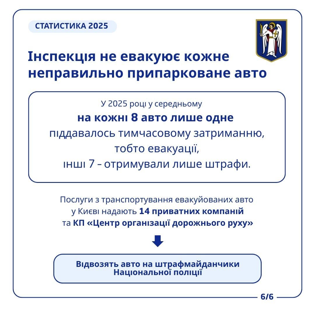"Тариф на транспортування евакуйованих авто не є державно регульованим, а отже міська влада не затверджує його розмір. [...] Новий тариф роботи приватних операторів буде тотожним розміру плати за транспортування транспортного засобу повною масою до 2 тис. кг, якщо евакуацію виконує Національна поліція України", – зазначили в КМДА.