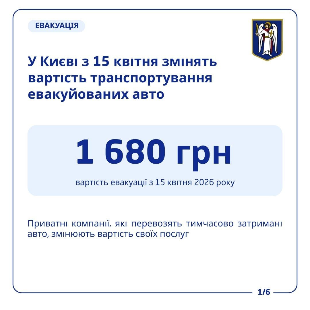 Як повідомили в Київській міській державній адміністрації, з 15 квітня 2026 року мінімальна вартість транспортування тимчасово затриманого транспортного засобу становитиме 1 680 грн.
