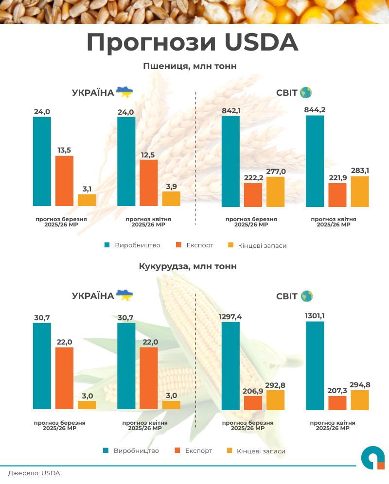 Департамент сільського господарства США (USDA) 9 квітня опублікував світовий прогноз балансу основних сільськогосподарських культур на 2025-2026 маркетинговий рік. Згідно з його даними, показники України щодо обсягів виробництва пшениці та кукурудзи залишаються на сталому рівні 24 млн тонн та 30,7 млн тонн відповідно.
