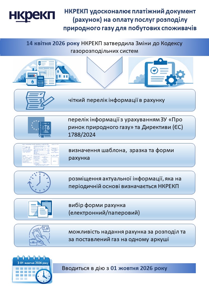 Національна комісія, що здійснює державне регулювання у сферах енергетики та комунальних послуг (НКРЕКП), ухвалила постанову №541, якою внесла зміни до Кодексу газорозподільних систем і оновила вимоги до платіжних документів за розподіл природного газу для побутових споживачів.