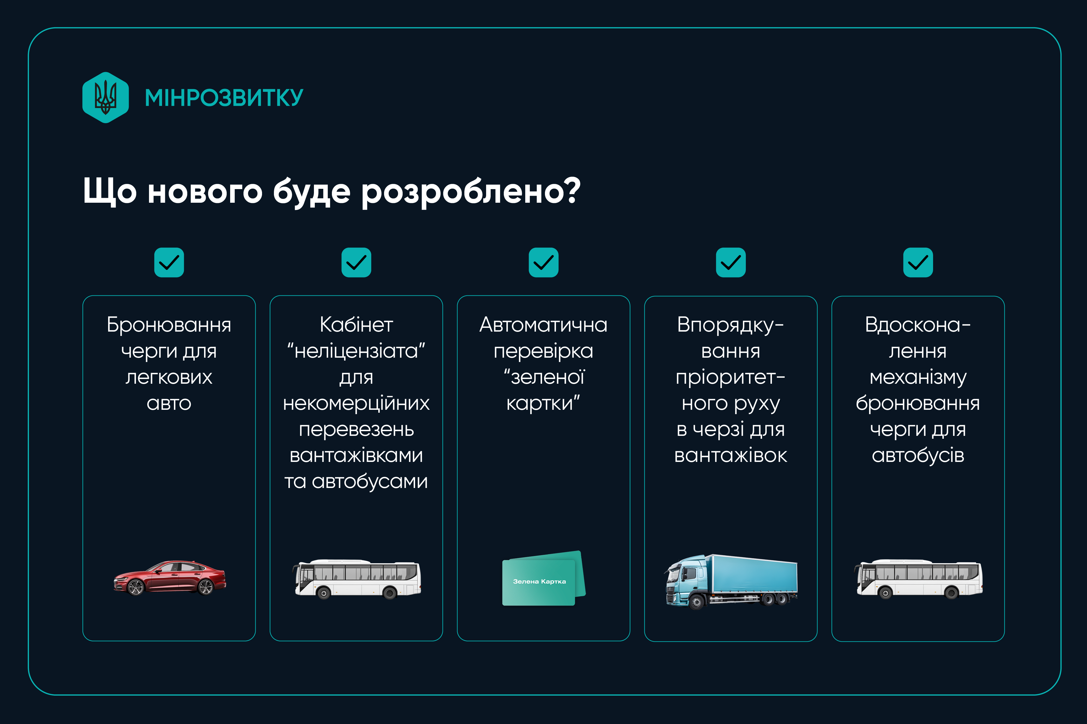 Міністерство розвитку громад та територій розпочинає створення нового функціоналу системи "єЧерга", що передбачає розширення її застосування для легкових автомобілів, а також оновлення можливостей для комерційного транспорту ‒ вантажівок і автобусів.