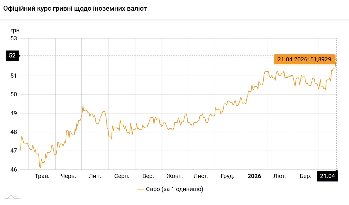 Водночас курс гривні до євро знизився ще на 2 копійки – до 51,9113 грн за євро. Це новий історичний мінімум, попередній було зафіксовано 21 квітня на рівні 51,8929 грн за євро.