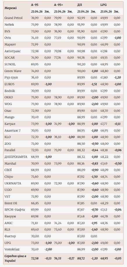 Загалом, згідно з моніторингом Консалтингової групи "А-95", з 13 по 20 квітня середня ціна дизельного пального на АЗС знизилася на 60 коп. (до 89,92 грн/л), бензину – на 42 коп. (72,71 грн/л), а скрапленого газу – на 5 коп. (до 48,99 грн/л).