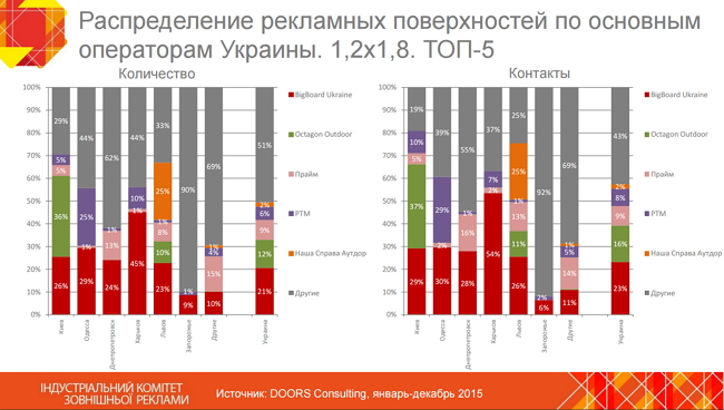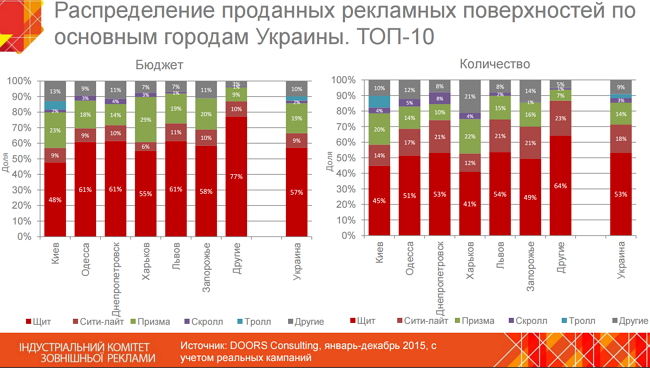Согласно данным Doors Consulting, в целом в 2015 доля бордов в Киеве составила 59% от общего числа носителей. При этом сити-лайт занял лишь 23%.