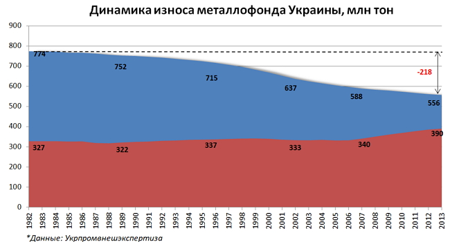 По данным госпредприятия "Укрпромвнешэкспертиза" (УПЭ), на 2013 год объем полностью изношенного металлофонда составлял около 390 млн тонн. Это является следствием недостаточного уровня капитальных инвестиций за предыдущие 20 лет.