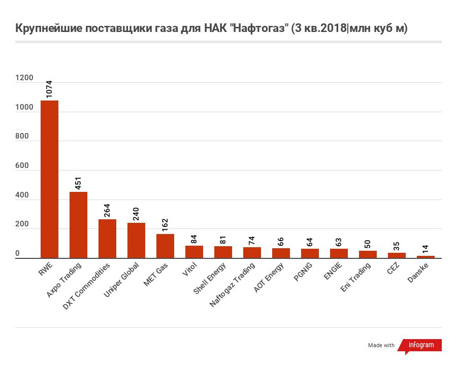 Крупнейшим поставщиком газа для "Нафтогаза" была немецкая компания RWE. Она продала украинской монополии 1,1 млрд куб м газа.