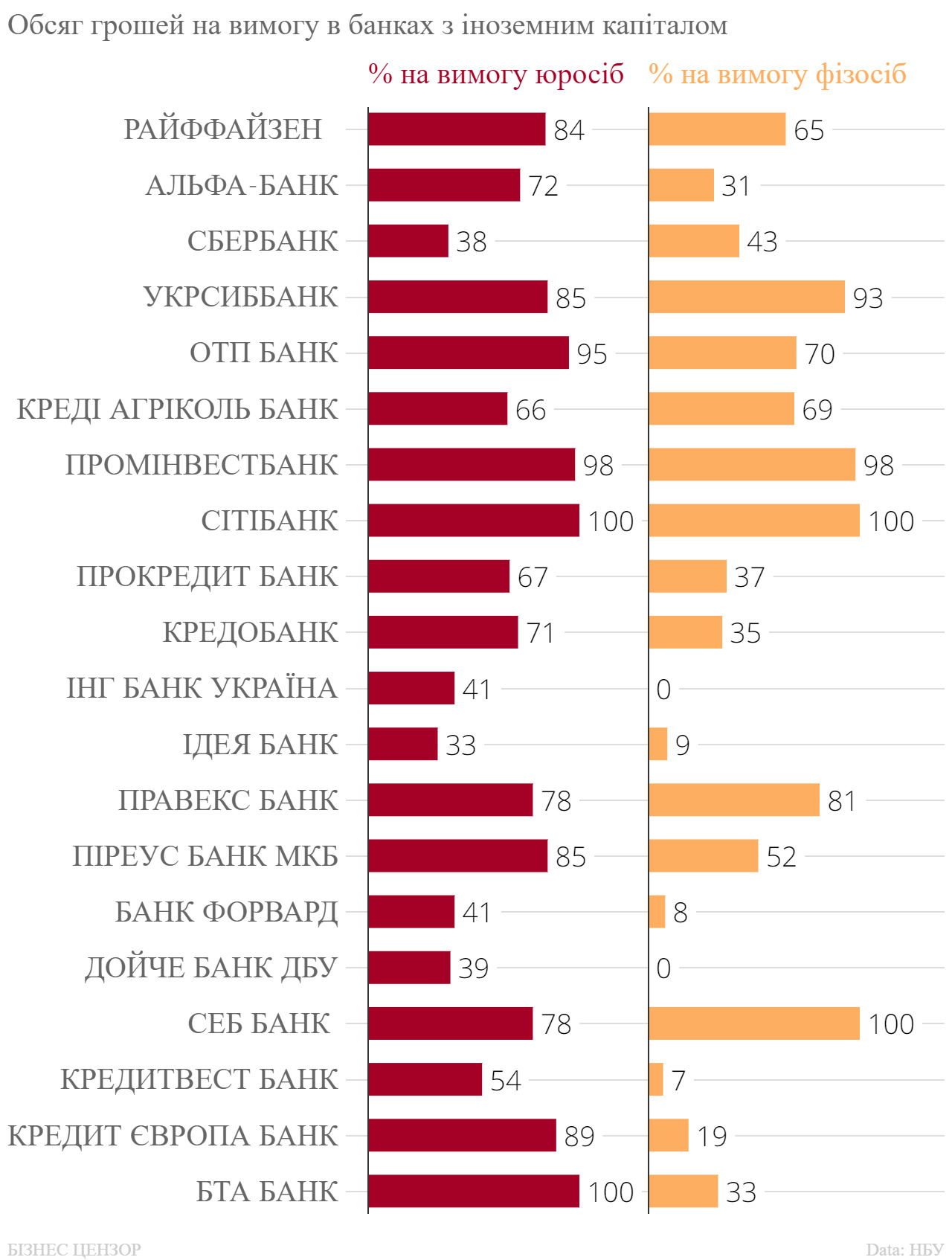 У банках з іноземним капіталом загальний 69% грошей на вимогу. В тому числі 80% "на вимогу" грошей юридичних осіб, та 54% - у фізичних осіб.