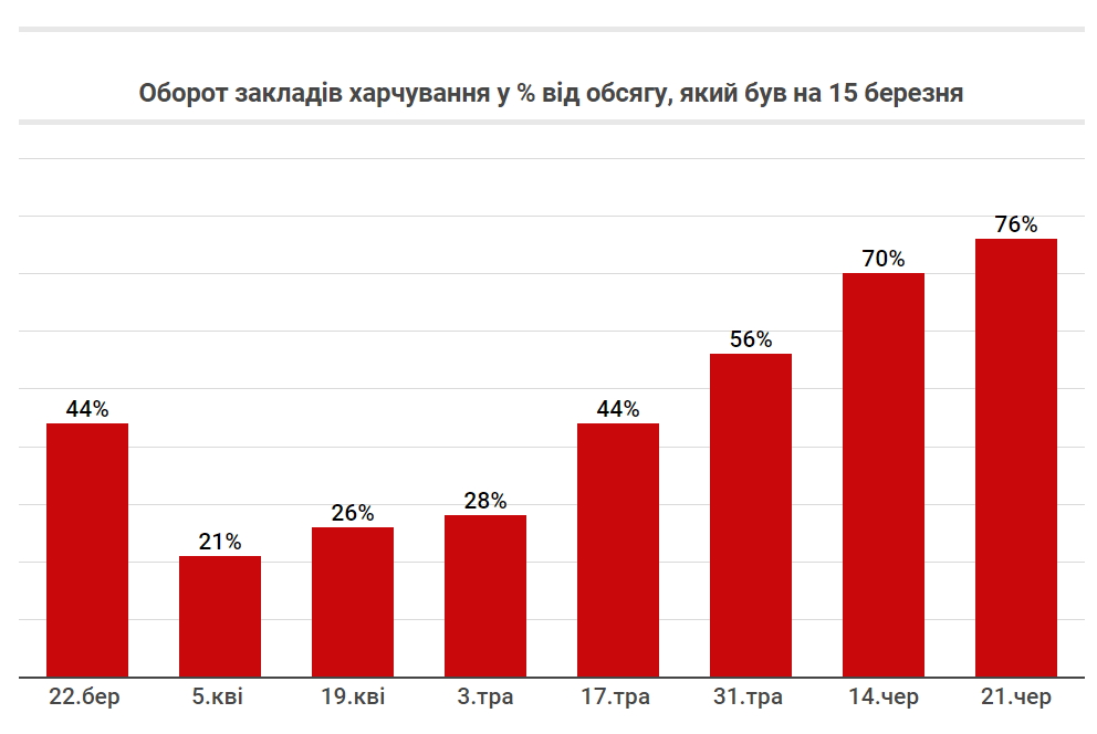 Після введення карантину обороти закладів харчування впали до 44% від рівня 15 березня і в квітні опустились до 26%. Єдиним джерелом доходу кафе була доставка їжі.