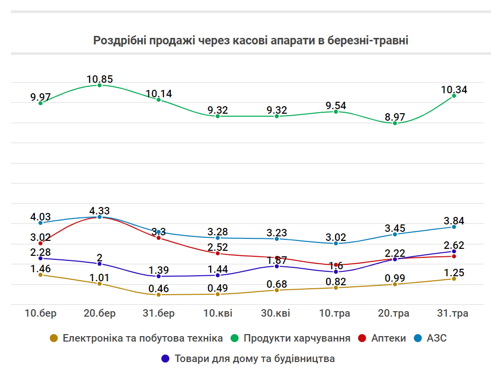 Ці данні свідчать, що докарантинні обороти офіційних продавців електроніки, їжі, ліків, пального та будматеріалів були більшими. Статистика не враховує реалізацію "сірої" продукції, кількість якої в кризу, ймовірно, зросла.