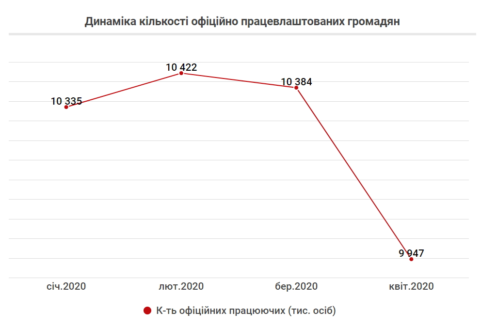 В квітні кількість офіційно працюючих громадян України впала нижче десяти мільйонів чоловік – 9,95 млн чоловік. Відзначимо, що за даними електронного перепису, в Україні проживає всього 37,3 млн чоловік. Водночас, ще в лютому 2020 року кількість офіційно працевлаштованих становила 10,42 млн чоловік.