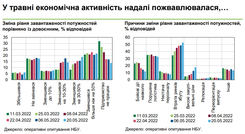 У травні стабілізувалася частка підприємств, які суттєво скоротили (понад 30%) працівників, та тих, хто не змінив їх кількість. Середньозважений рівень зайнятості поліпшився, що, однак, може пояснюватися сезонністю. Однак він все ще на 25% нижчий, ніж до війни.