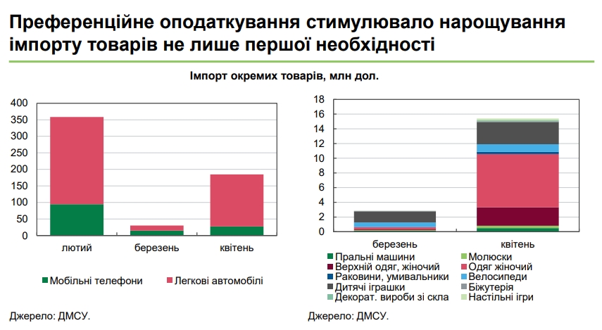 Порівняно з березнем у квітні збільшився імпорт: легкових автомобілів – у 10 разів; мобільних телефонів – майже удвічі; пральних машин – вчетверо; раковин, умивальників – у 13 разів, декоративних виробів зі скла – у 13 разів.