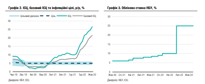 Інфляція в Україні сягнула 26.6% р/р у жовтні. Пікового значення у 32% індекс споживчих цін може досягнути у лютому 2023 року і почне уповільнюватися з березня через ефект високої бази порівняння, прогнозує ICU.