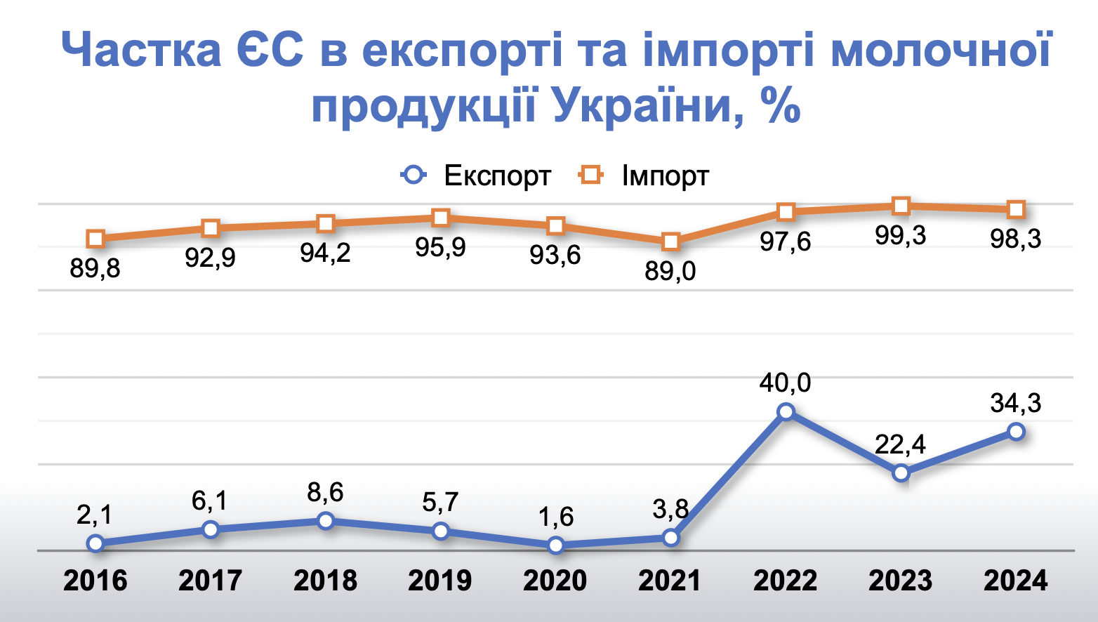 Відповідно до результатів дослідження Державного НДІ інформатизації та моделювання економіки, від початку повномасштабного вторгнення частка ЄС у вітчизняному експорті молочної продукції зросла з 1,6-3,8% до 22,4-40%.